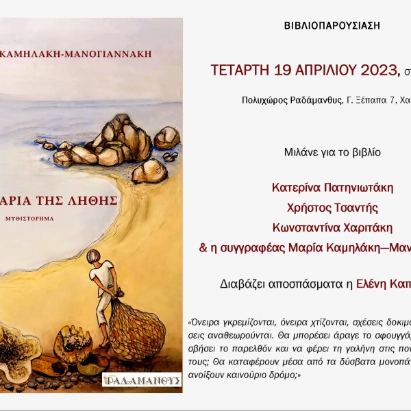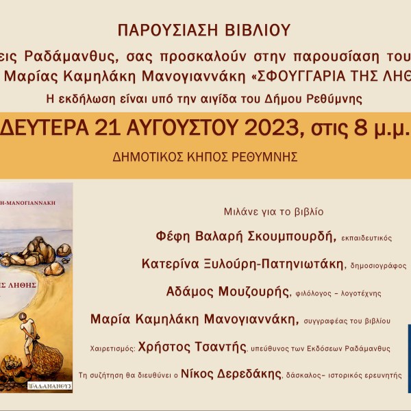 από Ραδάμανθυς - Εκδόσεις, Πολυχώρος, Εργαστήρια Δημοσιεύθηκε την 08/08/2023 Βιβλιοπαρουσίαση στο Ρέθυμνο – Μαρία Καμηλάκη Μανογιαννάκη «Σφουγγάρια της λήθης» Ανάγνωση του υπολοίπου