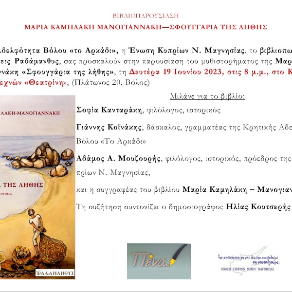 από Ραδάμανθυς - Εκδόσεις, Πολυχώρος, Εργαστήρια Δημοσιεύθηκε την 11/06/202311/06/2023 Βιβλιοπαρουσίαση στο Βόλο – «Σφουγγάρια της λήθης», Μαρία Καμηλάκη Μανογιαννάκη Ανάγνωση του υπολοίπου