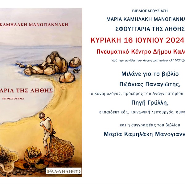 από Ραδάμανθυς - Εκδόσεις, Πολυχώρος, Εργαστήρια Δημοσιεύθηκε την 30/05/202402/06/2024 ΒΙΒΛΙΟΠΑΡΟΥΣΙΑΣΗ ΣΤΗΝ ΚΑΛΥΜΝΟ – ΜΑΡΙΑ ΚΑΜΗΛΑΚΗ ΜΑΝΟΓΙΑΝΝΑΚΗ «ΣΦΟΥΓΓΑΡΙΑ ΤΗΣ ΛΗΘΗΣ» Ανάγνωση του υπολοίπου