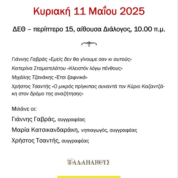 από Ραδάμανθυς - Εκδόσεις, Πολυχώρος, Εργαστήρια Δημοσιεύθηκε την 03/05/2025 Βιβλία – αληθινές ιστορίες – Διεθνής Έκθεση Βιβλίου Θεσσαλονίκης 11/5/2025 Ανάγνωση του υπολοίπου