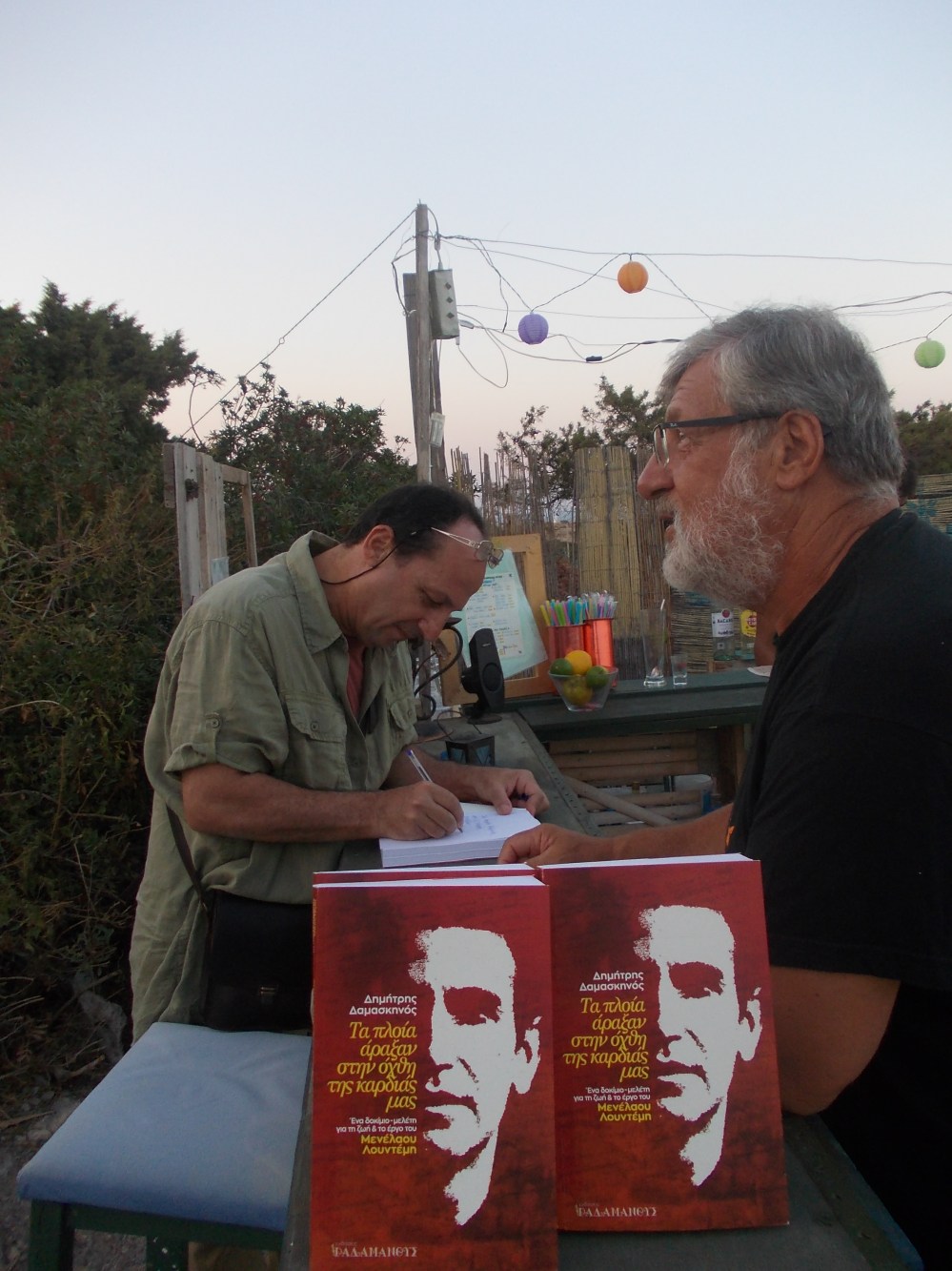 Ο Δημήτρης Δαμασκηνός υπογράφει βιβλία του πριν από την εκδήλωση στο σπίτι των εξορίστων, στη Γαύδο