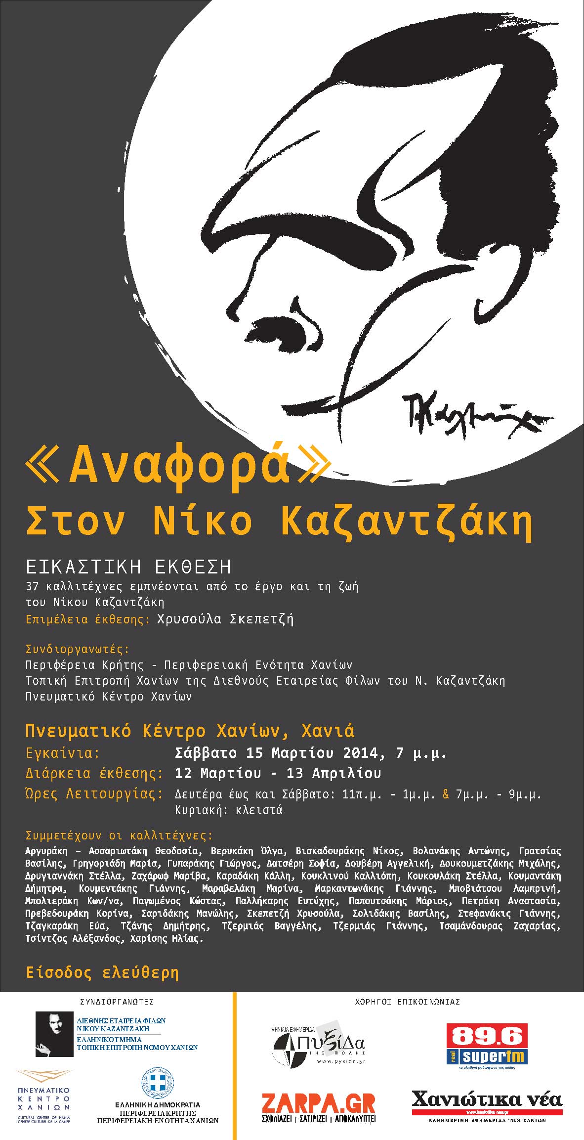από Ραδάμανθυς - Εκδόσεις, Πολυχώρος, Εργαστήρια Δημοσιεύθηκε την 01/04/201430/06/2015 «Ο διαχρονικός Καζαντζάκης». Σάββατο 5 Απρίλη 2014, στα Χανιά. Ανάγνωση του υπολοίπου